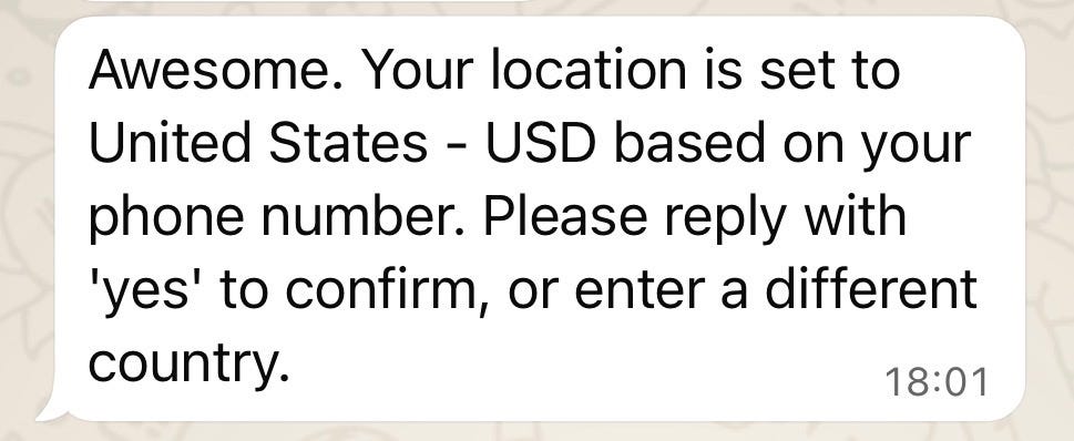 Currency & Locale: One benefit of WhatsApp is that your phone number does provide some signals which could be useful, because it ties you back to a country. With the country, I can identify the language and currency you likely want to use.