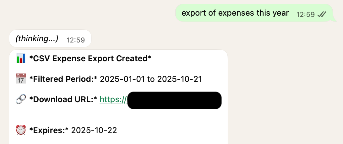 Exports: I believe in open data, so I added the option for users to export their transaction information anytime, whether for personal use or to share with a bookkeeper they likely already communicate with on WhatsApp. Given the sensitivity of this data, I implemented auto-expiring download links for these CSV exports.