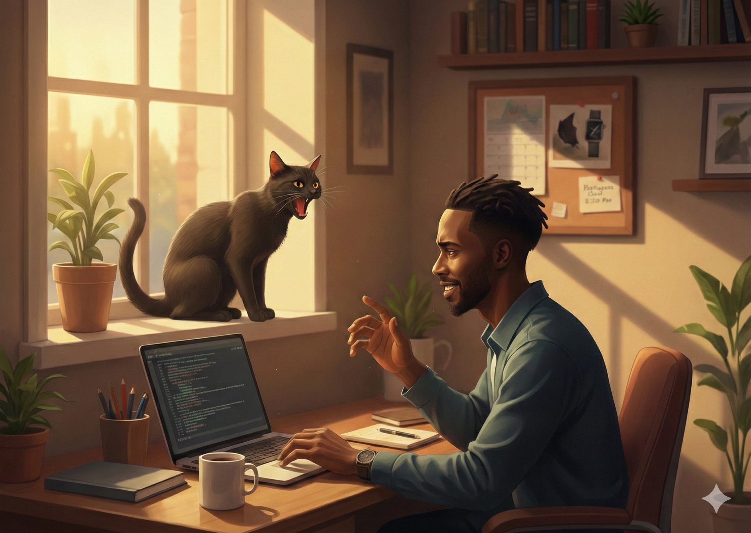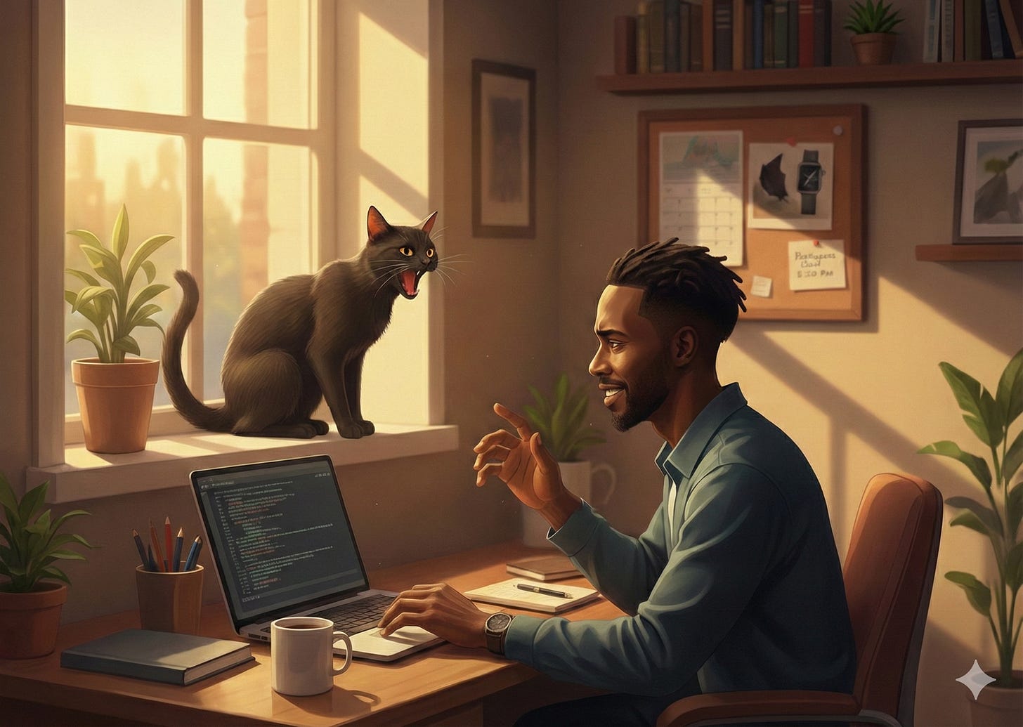 It’s 11am. I’m deep in something: a feature, a thread, a rabbit hole that felt important 20 minutes ago and probably still does. Then I hear it. The cat is meowing.